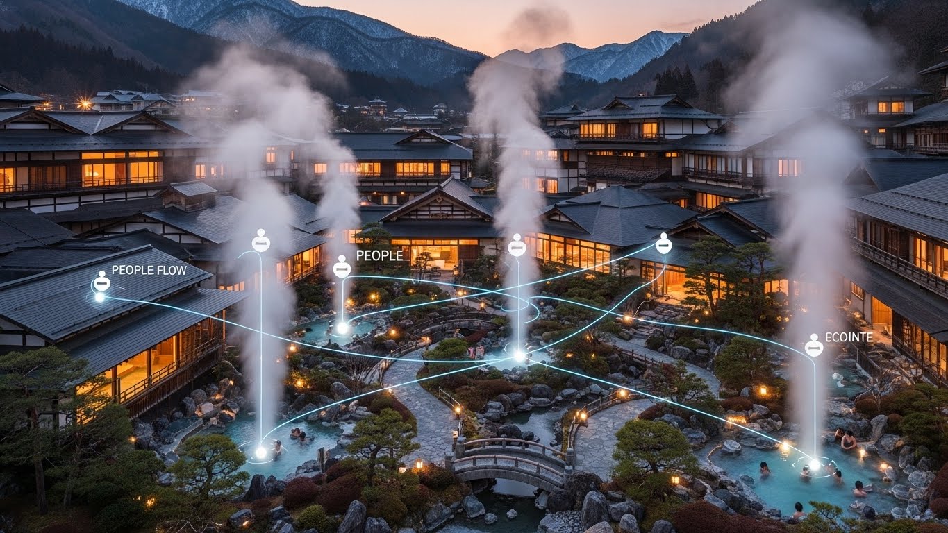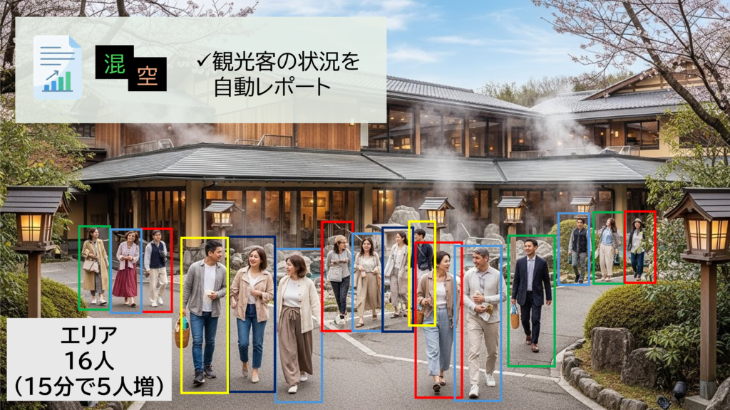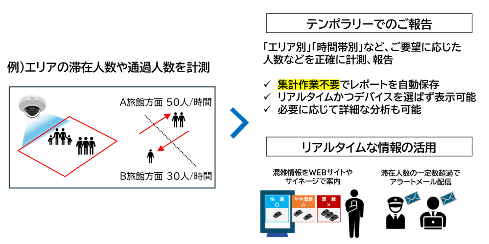 多くの観光客が訪れる温泉街や社寺仏閣、自然公園、商店街などの観光地を、実際にどれくらいの人が訪れ、どの地点で混雑が発生しているのか。従来、それを調べるには、現地に人員を長時間配置するなど、計測に人手と時間をかける必要がありました。
