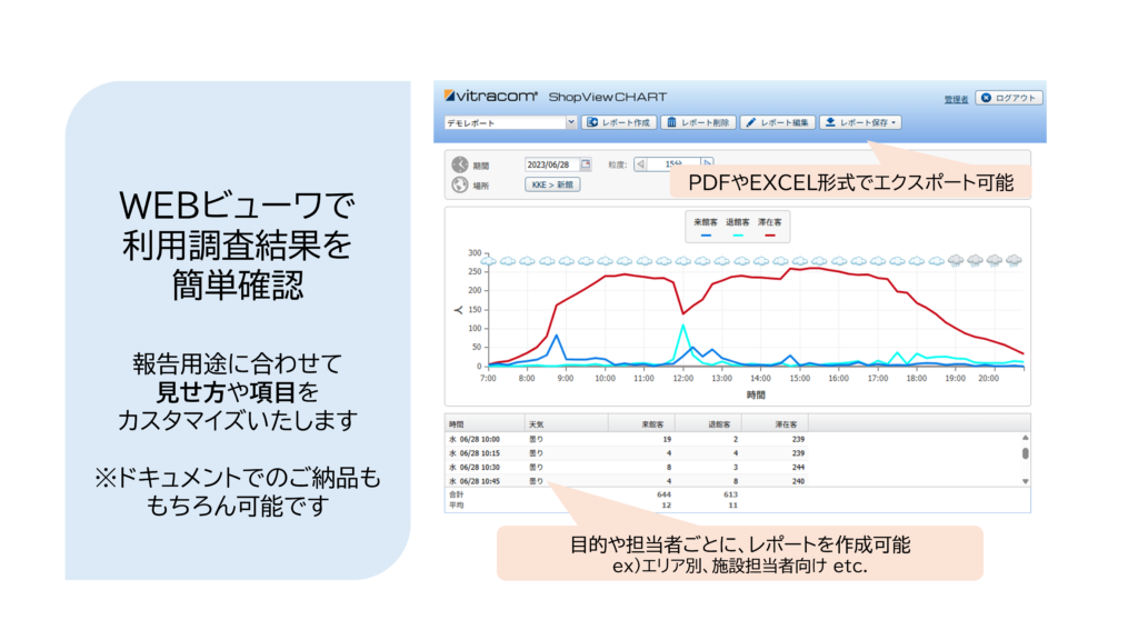 ⇒施設内の混雑度、特定のエリアへの集中度を可視化。データに基づき、人員配置の適正化やサービス改善、レイアウト見直しの根拠を提供します。