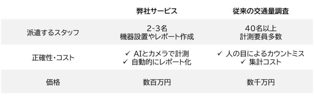 従来の交通量調査では、複数名の人員を長期間配置する必要がありました。人手不足や人件費の高騰から、実施にかかる期間や調査費用が年々増加しております。
