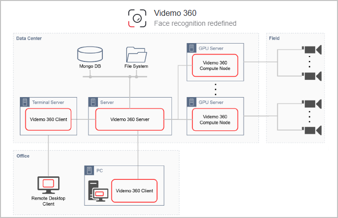 Videmo 360 Server : 画像・映像解析エンジン, データ保管, API提供 Videmo 360 Client : ユーザ操作アプリケーション Videmo 360 Camera-Endpoint : 専用映像解析エンジン (optional) |